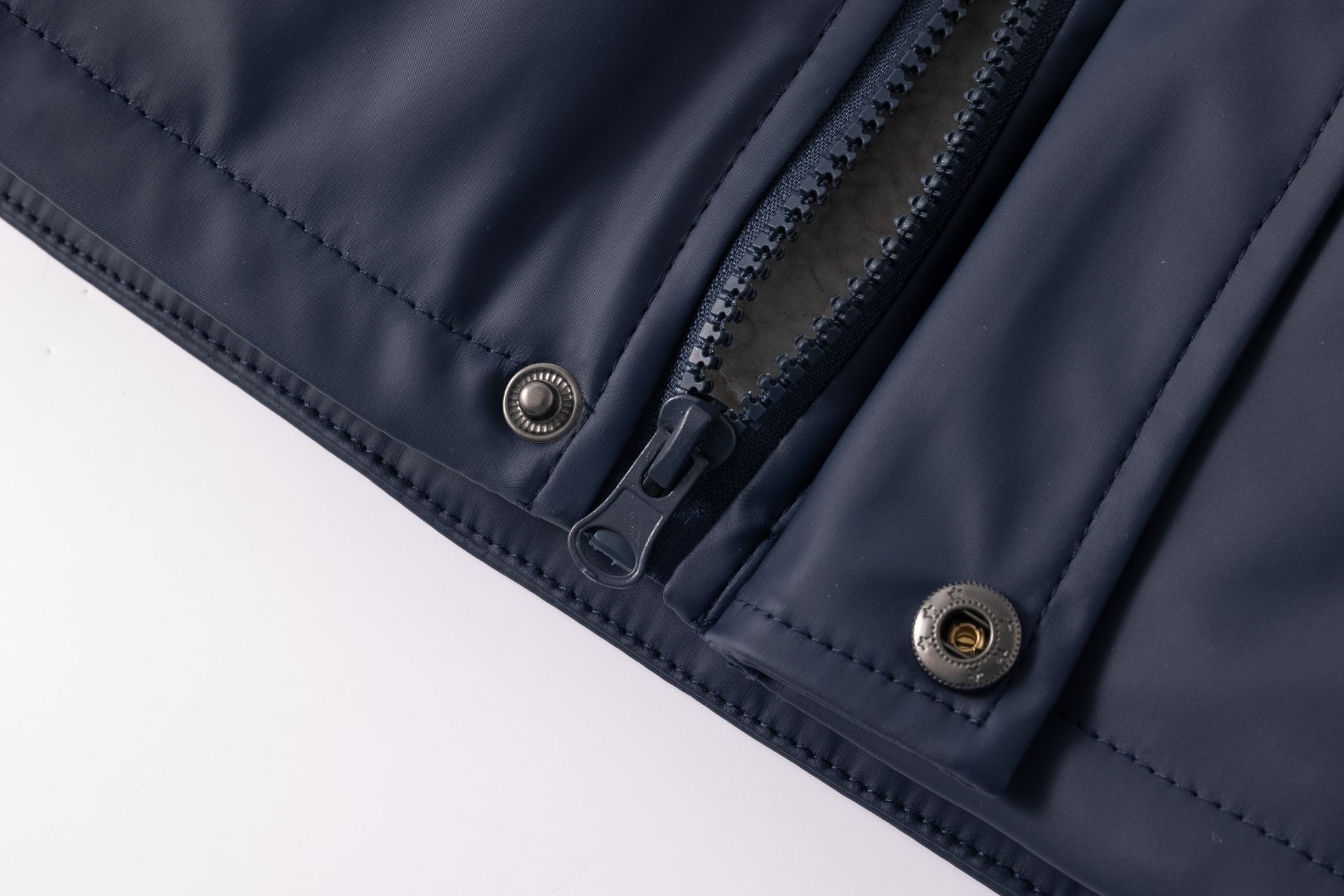 Chubasquero con capucha y manga larga acabado en puño interior. Cierre cremallera frontal. Bolsillos delanteros con detalle vivo. Forro tejido borreguito. Tejido especial repelente al agua.