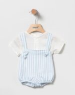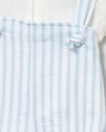 Conjuntos de bloomer con tirantes azul de rayas y camisa blanca. Tirantes anudados y corchetes de cierre. Camisa con cuello redondo, de manga corta y botones decorativos.Modelo: 80361 Composición:  100% Algodón