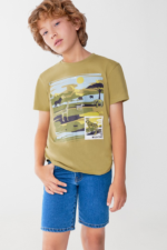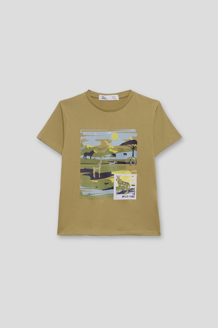 Camiseta de manga corta para niño de 2 a 16 años. Camiseta en color tierra con un vibrante estampado frontal de un paisaje de safari, donde se aprecian jirafas, cebras y elefantes en plena naturaleza. El diseño se complementa con un detalle de parche bordado con la frase «Wild Ride», añadiendo un toque de textura y dinamismo. Su cuello redondo y corte clásico la convierten en una prenda cómoda y fácil de combinar. Confeccionada en algodón ligero y transpirable, es ideal para los días de verano, ofreciendo frescura y un estilo aventurero perfecto para pequeños exploradores.