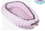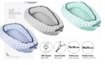 Este cojín permite tener a tu bebe cómodo y seguro en cualquier lugar. Colócalo encima de la cama, en el interior de una cuna o en el suelo. Aconsejado para bebes de 0-6 meses Tejido exterior de punto de algodón 100%, interior de la abse y el rulo 100% poliester, de esta manera se consigue un mayor confort para el bebe. Apertura ajustable mediante una cinta elástica. Desefundable para un fácil lavado. Medida base: 76×39 cm Medida totales: 86×50 cm