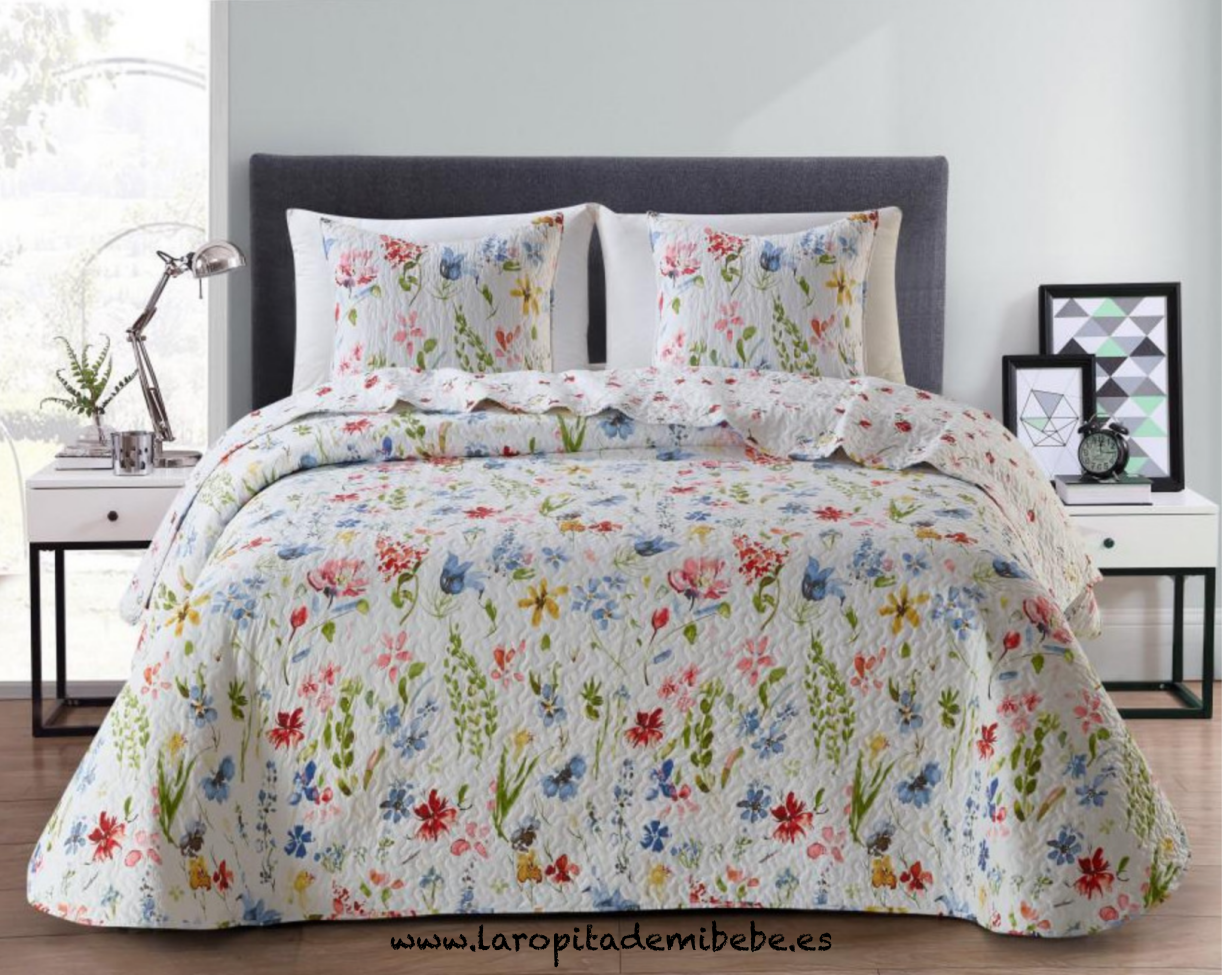 Colcha bouti reversible de microfibra estampada con bonito dibujo floral en el frente y reverso del boutie. El tacto de la microfibra es suave y natural dando sensación de tacto algodón. Las medidas de cama grande (Cama de 135 y 150) llevan dos cojines incluidos. Cojines coordinados de 50×50 cms.