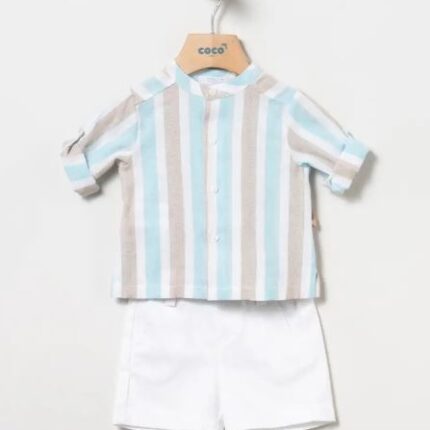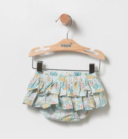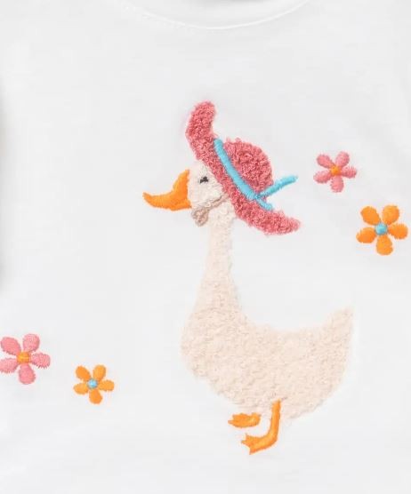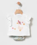 Conjuntos de camiseta blanca de algodón con estampado de oca y flores, mangas de volantes y cuello redondo. Bloomer de volantes con estampado Liberty en tonos rosas, naranjas y azules.Modelo: 80391 Composición:  100% Algodón