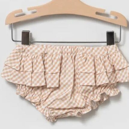 Conjunto de blusa con estampado Liberty en tonos rosas, naranjas y azules, volante en cuello y mangas y botones. Bloomer rosa con volantes.Modelo: 80392 Composición:  54% Lino,46% Algodón