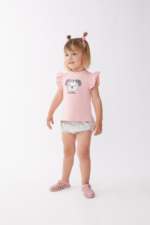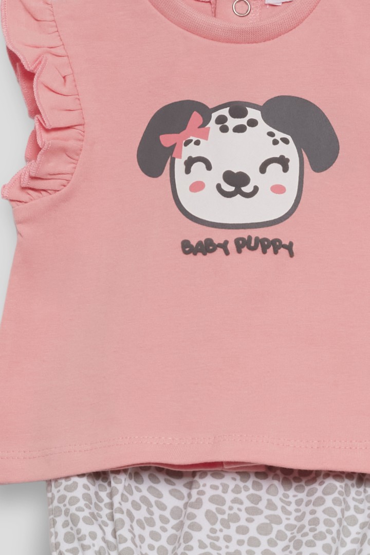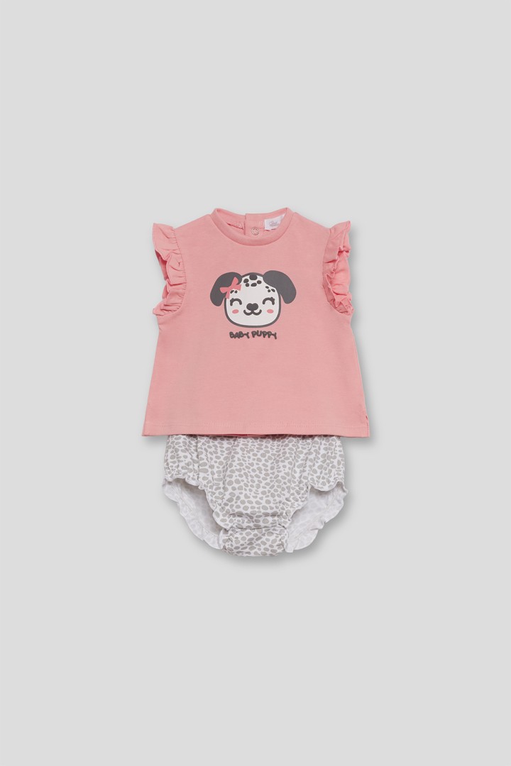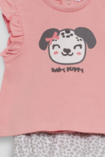 Conjunto de dos piezas para recién nacido niña de 1 a 24 meses. Camiseta sin mangas en color rosa con estampado central de perrito. Detalle de volantes en los hombros que aportan un toque dulce y delicado. Cuello redondo y cierre con botones a presión en la parte trasera para facilitar el cambio. Braguita en color blanco con estampado de motas en tono gris. Diseño con volantes en la parte trasera y cintura elástica para un ajuste cómodo. Confeccionado en tejido suave y transpirable, ideal para los días cálidos de verano, garantizando comodidad y libertad de movimiento.