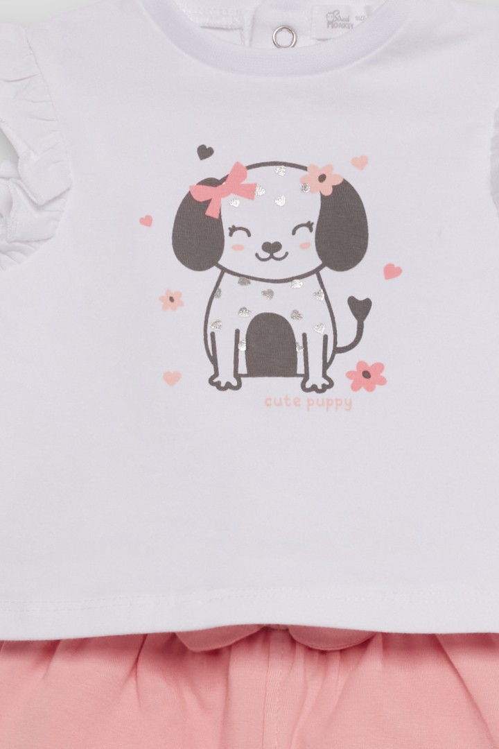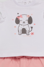 Conjunto de dos piezas para recién nacido niña de 1 a 24 meses. Camiseta sin mangas en color blanco con estampado central de perrito rodeado de corazones y flores. Detalle de volantes en los hombros que aportan un toque delicado. Cuello redondo y cierre con botones a presión en la parte trasera para mayor comodidad. Short en color rosa con diseño fluido y acabado ligeramente fruncido en la cintura para un ajuste cómodo. Cintura elástica para mayor flexibilidad y libertad de movimiento. Confeccionado en tejido ligero y transpirable, ideal para mantener la frescura en los días de verano.