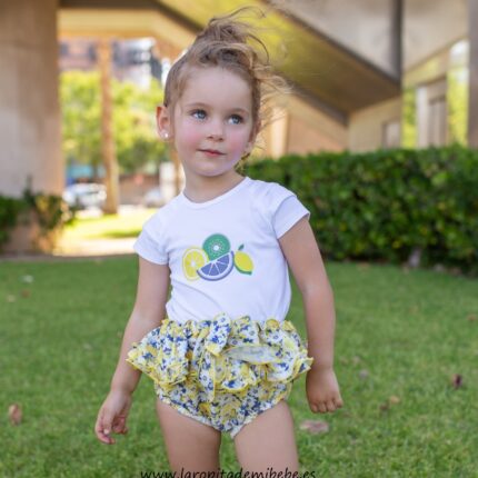 Conjunto de niña, de la nueva colección de Coco Aqua de Primavera/Verano, con cubre pañal de volante y camiseta.