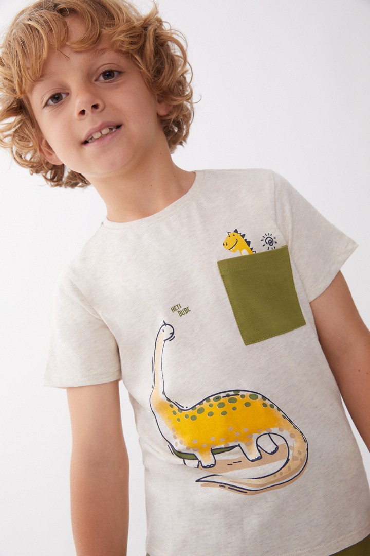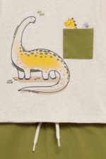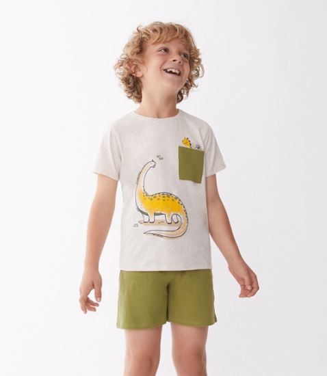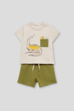 Conjunto de dos piezas, camiseta y short para bebé niño de 3 meses a 6 años. Camiseta en tono crudo con un simpático estampado de dinosaurio y un bolsillo decorativo en contraste con un pequeño dinosaurio asomando. En las tallas de meses, cuenta con cierre de botones en el hombro para mayor comodidad. Short en color verde oliva, confeccionado en un tejido fresco y ligero, con cintura elástica para un ajuste perfecto y mayor libertad de movimiento. Un conjunto lleno de encanto y diversión, ideal para los pequeños exploradores. ¡Porque cada día es una nueva aventura!