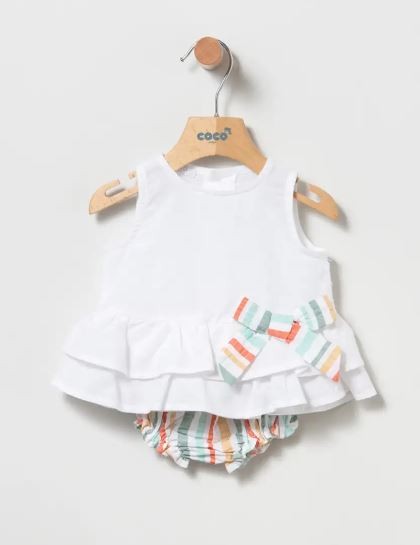 Conjunto de blusa blanca de tirantes con cuello redondo, lazo de rayas y volantes. Bloomer de rayas multicolor.Modelo: 80409 Composición:  68% Algodón,32% Lino
