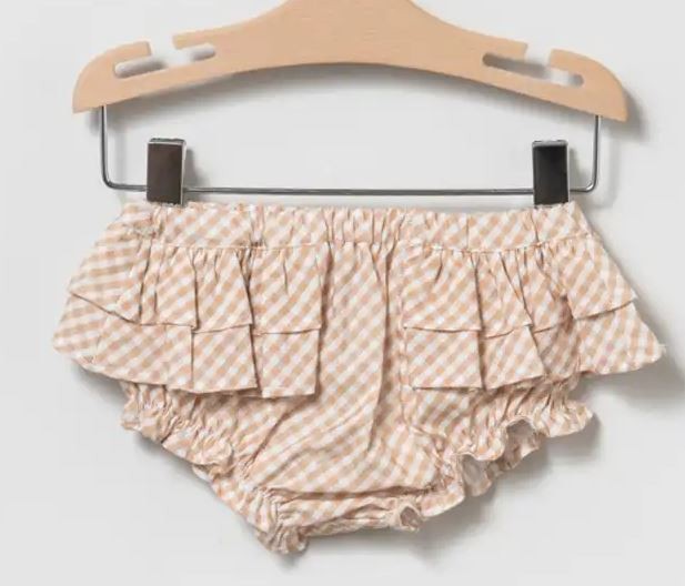 Conjunto de blusa blanca con estampado safari, cuello redondo con volante, mangas con volantes y botones en la parte delantera. Bloomer tostado de cuadro vichy con volantes.Modelo: 80374 Composición:  100% Algodón