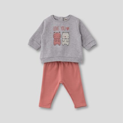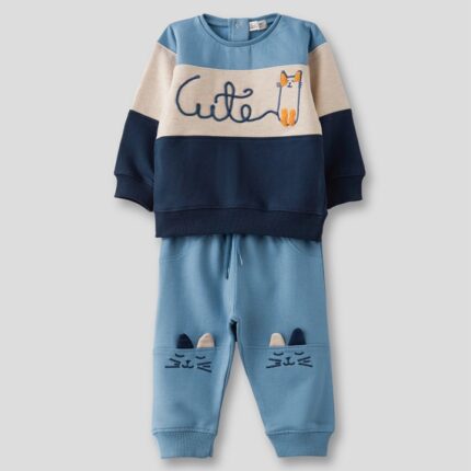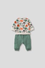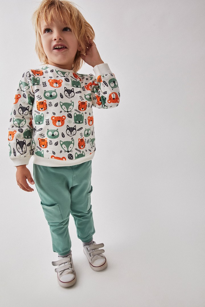 Conjuntos de dos piezas para recién nacido niño de 1 a 24 meses. La sudadera blanca está adornada con un estampado completo de animales en tonos verdes y naranjas, proporcionando un diseño alegre y llamativo. Confeccionada con un tejido suave y cálido, la sudadera incluye un cuello redondo y ajuste en los puños. El pantalón a juego en color verde presenta bolsillos laterales y una cintura elástica para un ajuste cómodo y seguro. Este Conjuntos es perfecto para cualquier ocasión, manteniendo a tu bebé abrigado y con estilo. Composición95% Algodón 5% Elastano