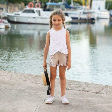 Conjuntos de blusa y shorts.Blusa de cuello mao con botones delanteros en blanco. Volantes laterales con acabado de puntilla.Shorts de rayas en tostado y blanco con goma en la cintura.