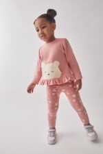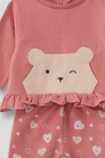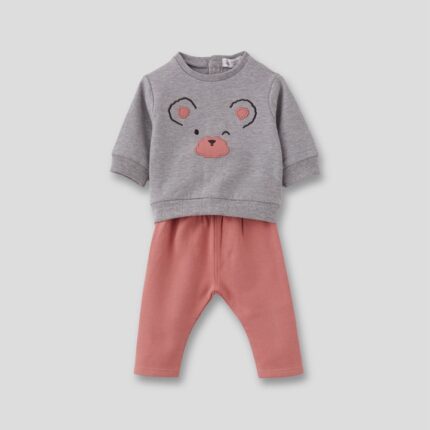 Conjuntos de dos piezas para recién nacido niña de 1 a 24 meses. Sudadera en color maquillaje con delicado detalle de afelpado en la parte inferior. Abertura frontal con botones a presión, cuello redondo, ajuste en puños y en el bajo de la sudadera. Pantalón en color maquillaje estampado con goma elástica en la cintura para un mejor ajuste. Tejido suave y elástico para mayor comodidad en los días de invierno. Composición 95% Algodón 5% Elastano