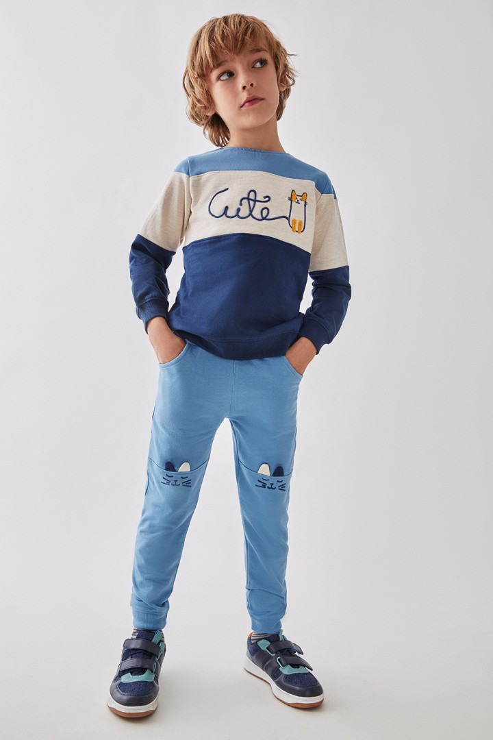Conjuntos de sudadera y pantalón. Sudadera en tonos azul marino y beige con un divertido bordado de un perrito y la palabra ‘Cute’, añadiendo un toque lúdico y adorable que encantará a tu pequeño. El pantalón azul claro complementa el Conjuntos, decorado con detalles de caritas de gato en las rodillas, aportando un estilo divertido y moderno. Confeccionado en un tejido suave y cálido, este Conjuntos es ideal para mantener a tu hijo cómodo y abrigado durante las estaciones más frescas. El diseño práctico y la elasticidad del material permiten libertad de movimiento, haciendo que sea perfecto tanto para jugar como para cualquier actividad diaria. La sudadera y el pantalón combinan a la perfección, ofreciendo un look coordinado y encantador.composición100% Algodón