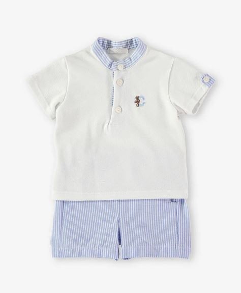 Conjuntos de polo y bermudas.Polo en blanco de cuello mao en rayas azul celeste. Botones delanteros y bordado en el pecho.Bermudas de rayas en blanco y azul celeste. Goma en la cintura y bolsillos laterales.