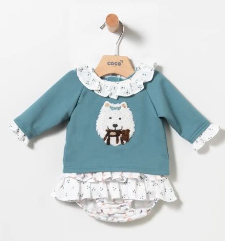 Conjuntos de jersey en Verde Agua con bordado de perro delante y volante de camisa en el cuello y puños.Bloomer blanco con estampado de animales y topos geométricos