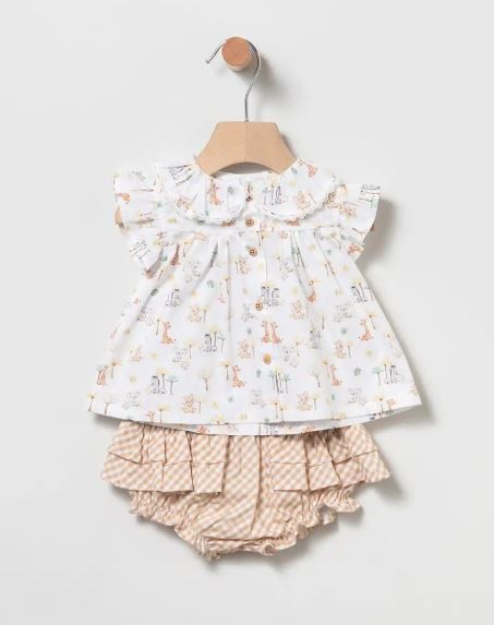 Conjuntos de blusa blanca con estampado safari, cuello redondo con volante, mangas con volantes y botones en la parte delantera. Bloomer tostado de cuadro vichy con volantes.Modelo: 80374 Composición:  100% Algodón