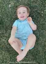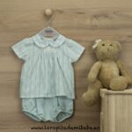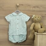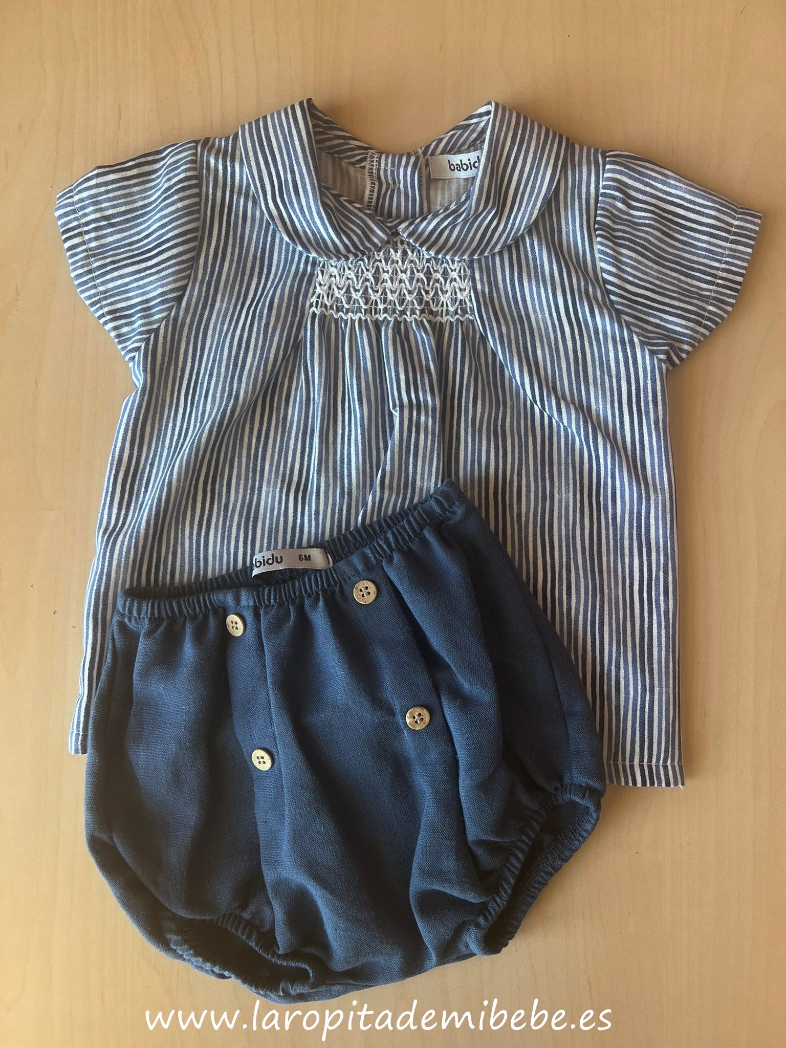 Conjuntos bebe niño  Ranita Más Camisa Cuello Bebé Manga Corta Índigo en color azul. Tejido A Rayas de Popelin 100% Algodón. Tejido de Lino, con 55% de algodón y 45% de Lino