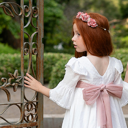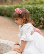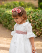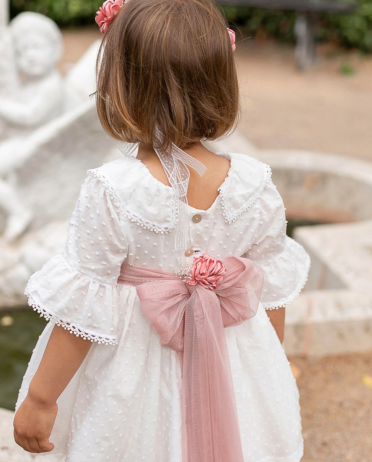 Jesusito de plumeti blanco con puntilla en cuello y manga y fajin rosa maquillaje con braguita de lino blancoComplementos (broche, accesorio cabello y calzado) no incluidos.