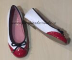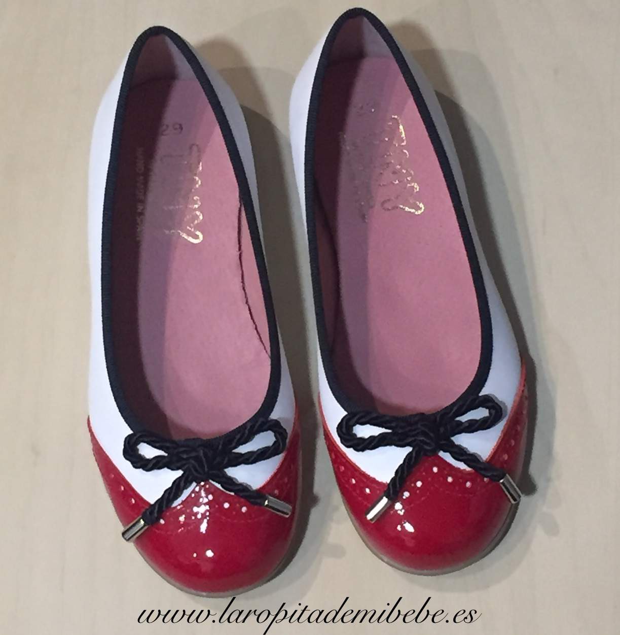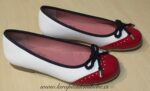 Preciosa manoletina marinera fabricada por Tinny Shoes. Manoletina en piel, combinando el charol y la napa, con detalles vivo en marino, con lazada trenzada. Fabricada en España.
