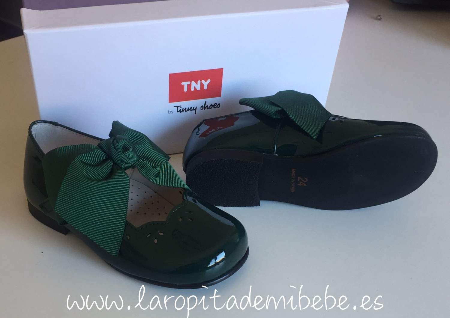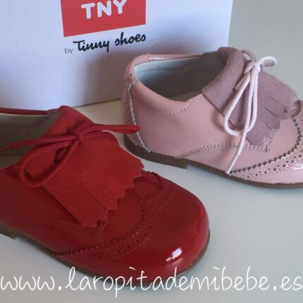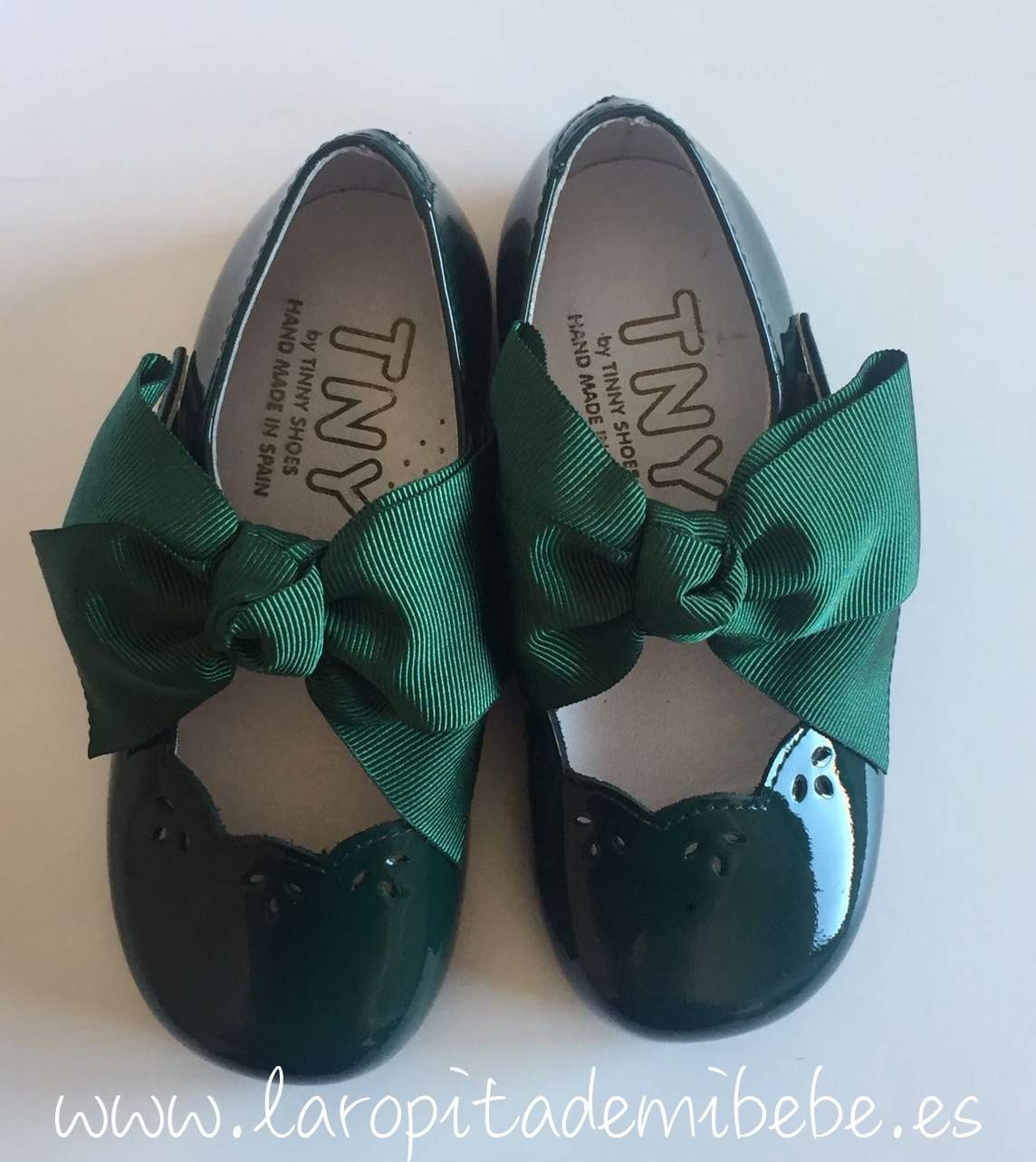 Preciosas merecidas de niña en charol, con ondas, y detalle de lazada. Fabricado en España por Tinny shoes