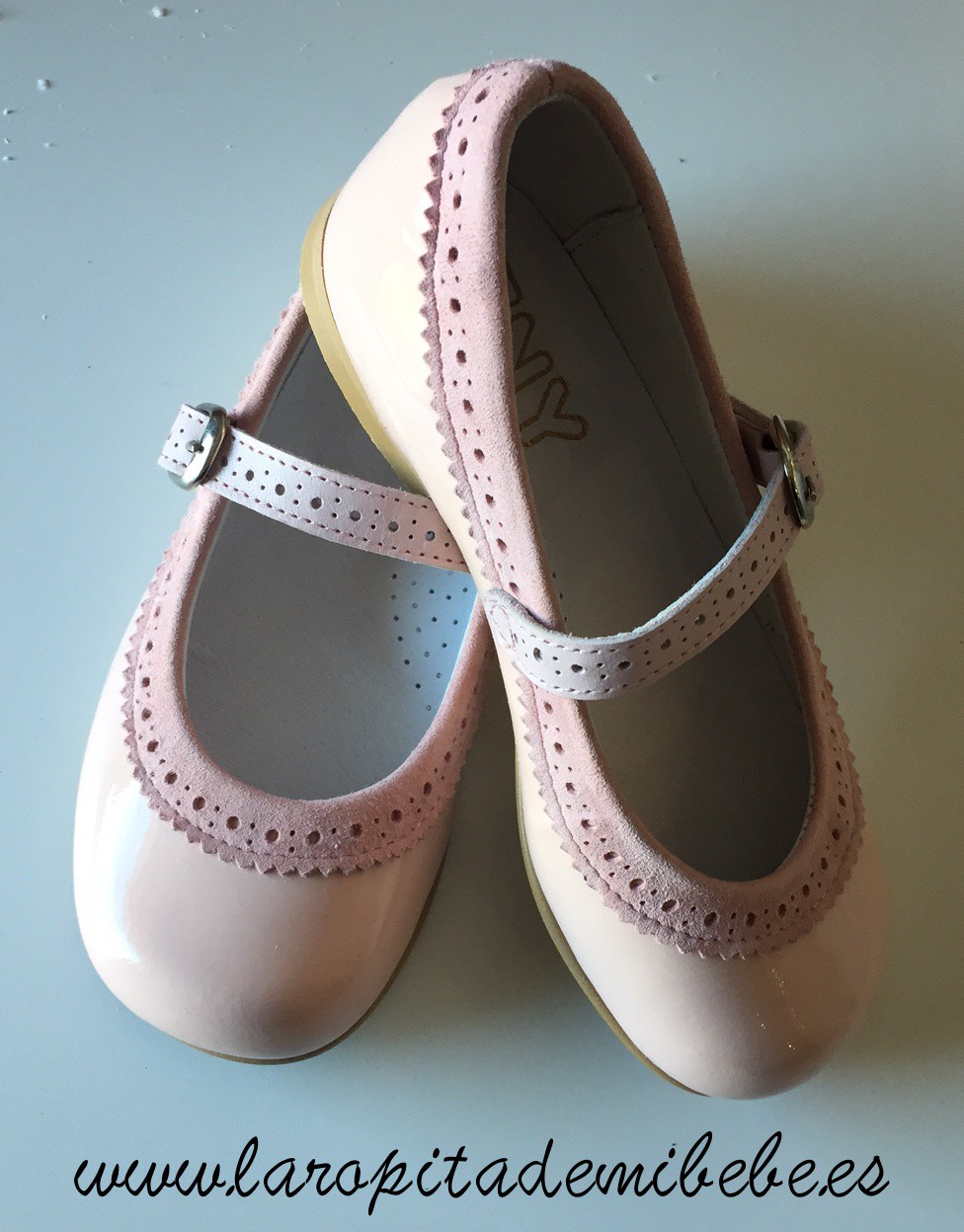 Preciosa mercedita de Tinny Shoes. Mercedita de niña en charol con detalle de borde y cierre en ante con detalles de picado. Interior en piel. Fabricado en España.