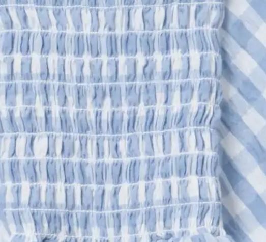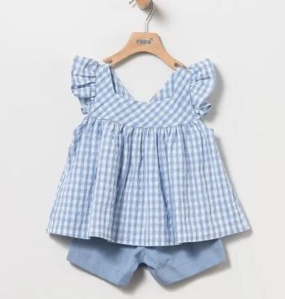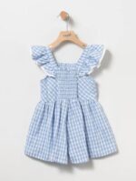Mono azul de cuadro vichy con goma en la zona del pecho y tirantes con doble volante.Modelo: 50296 Composición: 65% Poliéster,35% Algodón