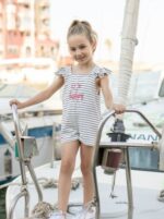 Mono corto de punto de rayas en azul marino y blanco.Volantes en las mangas.Bordado en el pecho.Cierre con cremallera en la espalda.Cierre con cremallera en la espalda.