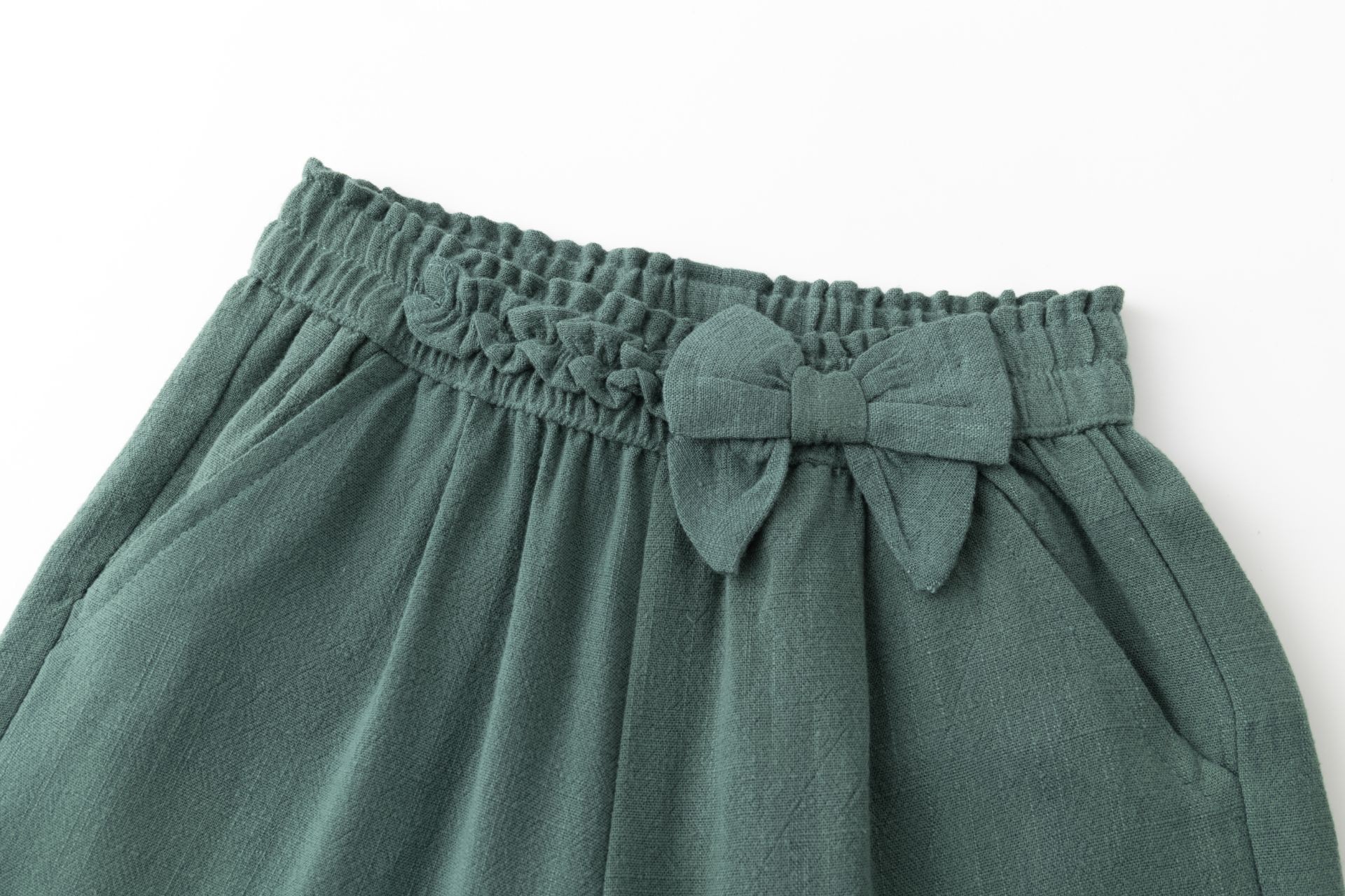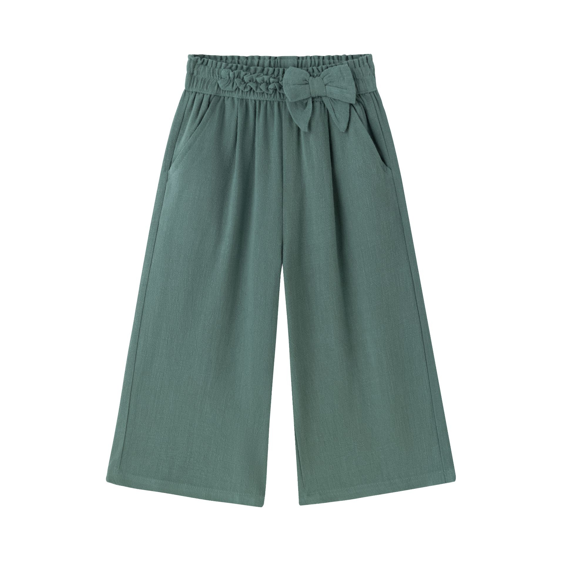 Pantalón de niña de pernera ancha, con cinturilla elástica ancha. Detalle decorativo de pieza fruncida y lazo a tono. Bolsillos laterales. En tejido de viscosa y lino, color verde liso.
