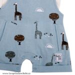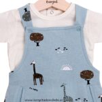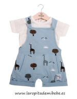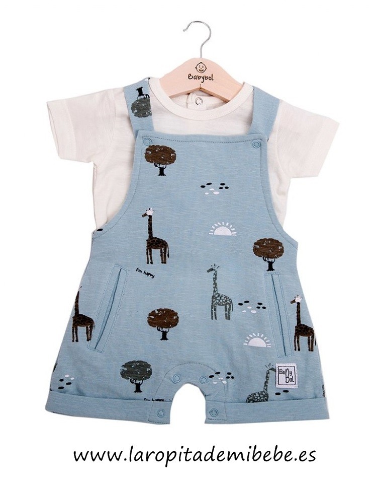 Conjuntos de 2 piezas, compuesto por peto de algodón estampado con bolsillos delanteros y abrochado en la entrepierna. Camiseta de manga corta lisa, abrochada en la espalda.