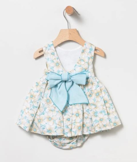 Vestido azul de flores con cuello redondo, sin mangas con una lazada azul en la cintura y unas braguitas azules de flores a Conjuntos. Vestido con forro.Modelo: 80338 Composición:  100% Algodón