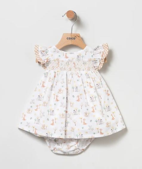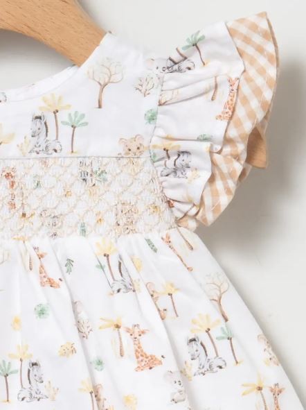 Vestido blanco con estampado safari con detalle de punto smock en el pecho en tostado. Cuello redondo y mangas con volantes. Braguita a Conjuntos.Vestido con forro.Modelo: 80373 Composición:  100% Algodón