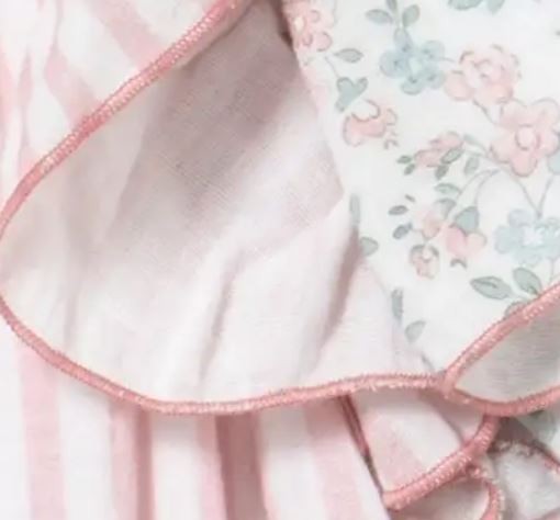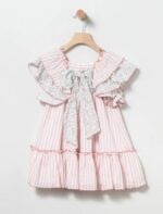 Vestido holgado de rayas rosas y blancas y detalles florales. Escote cuadrado y mangas de volantes y lazo en la espalda. Vestido con forro.Modelo: 50266 Composición:  100% Algodón