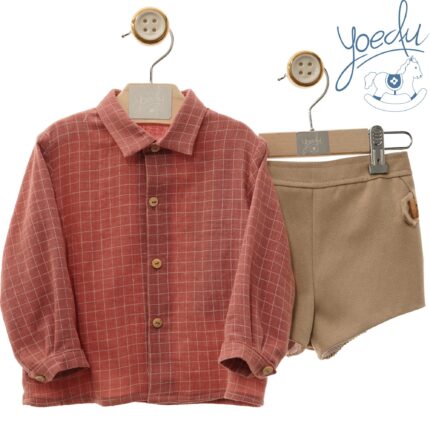 Vestido evasé de cuadros vichy en rosa y blanco. Volantes en hombros y puños. Cierre en la espalda con botones.Braguita de cuadros vichy en rosa a Conjuntos. Modelo:  Composición: 100% Algodón