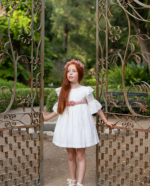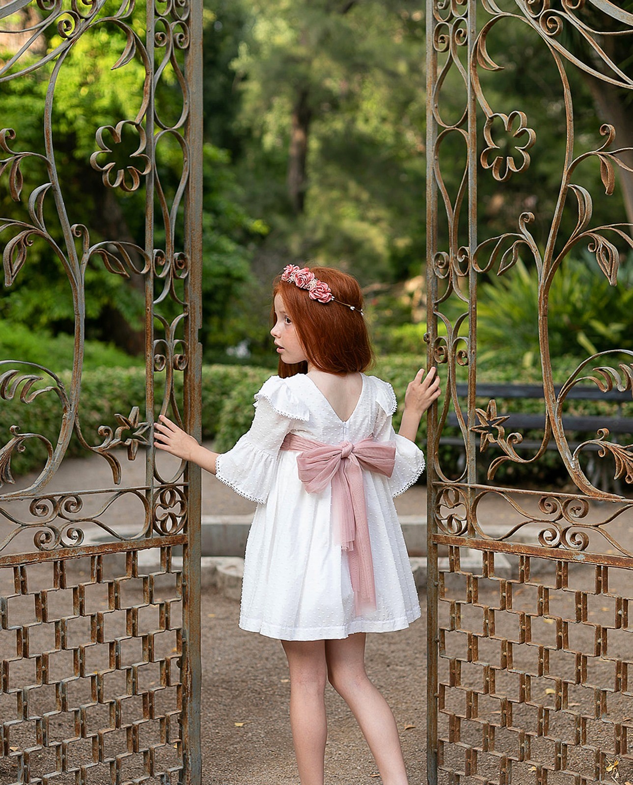 Vestido niña de plumeti blanco con puntilla en cuello y mangas y fajin tul maquillajeComplementos (broche, accesorio cabello y calzado) no incluidos.