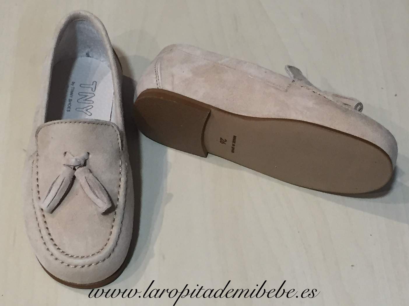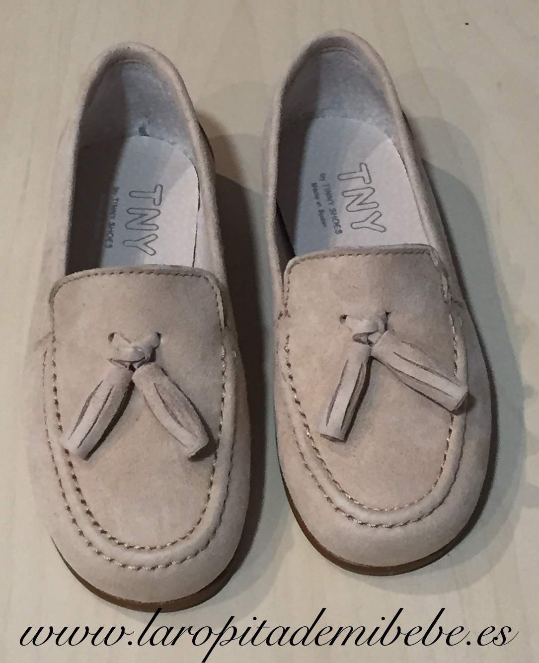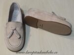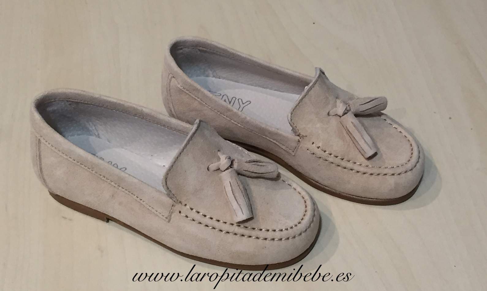 Precioso zapato fabricada por Tinny Shoes. Zapato en piel, fabricado en ante beige, con detalles de borlas. Fabricada en España.