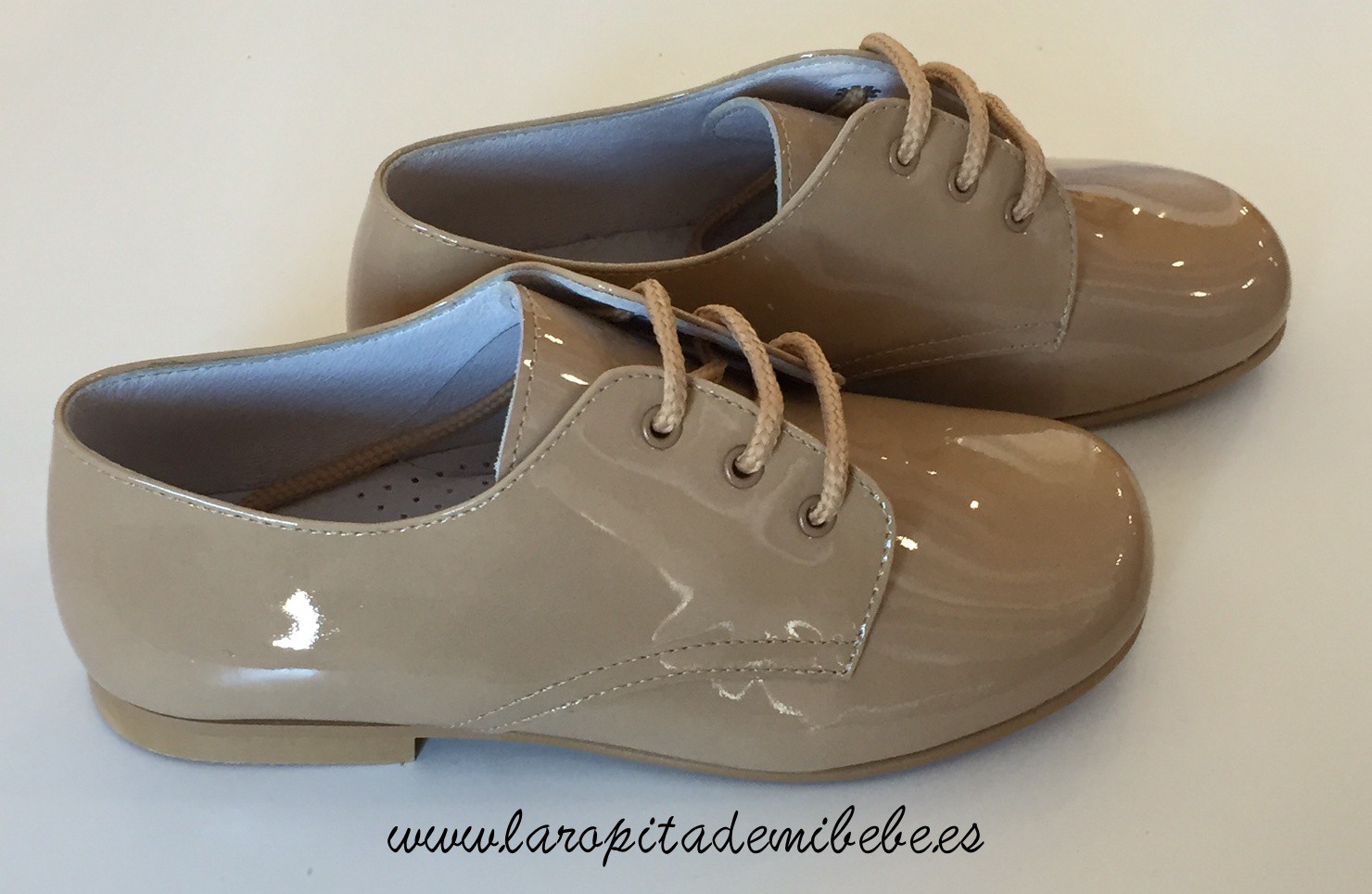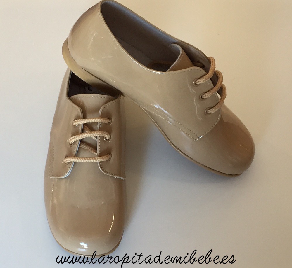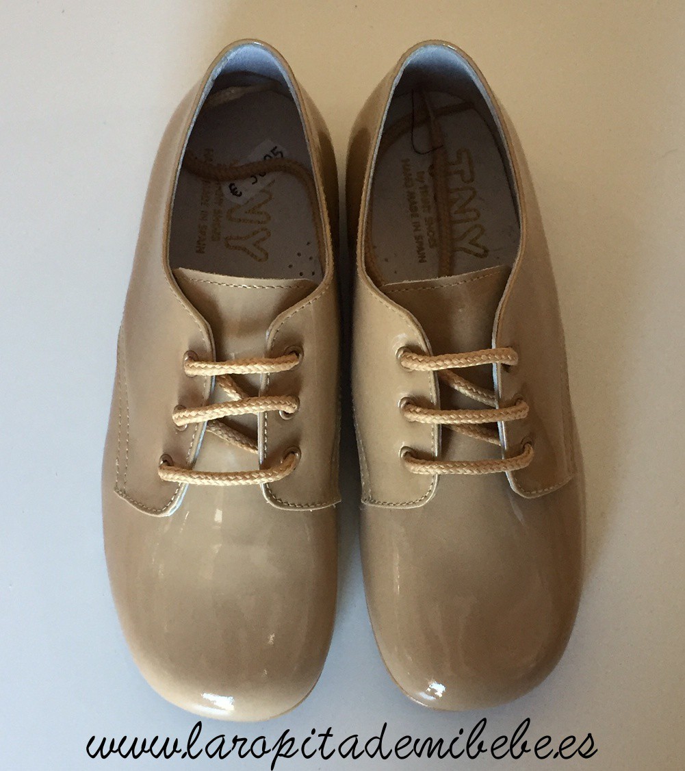 Precioso zapato de Tinny Shoes. Zapato de niño ingles en piel, con exterior en charol y cierre en cordones. Fabricado en España.
